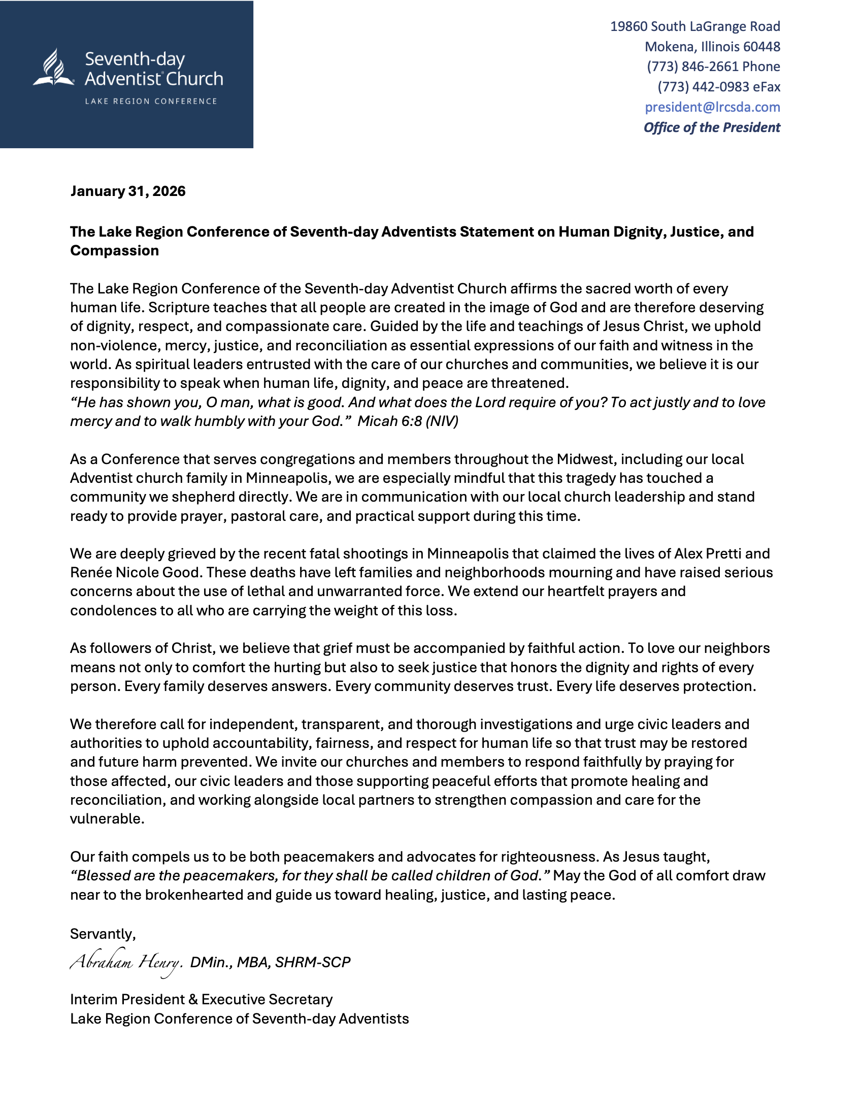 FOR IMMEDIATE RELEASE Lake Region Conference Announces Dr. Abraham Henry as Interim President Chicago, IL — January 12, 2026 The Lake Region Conference is pleased